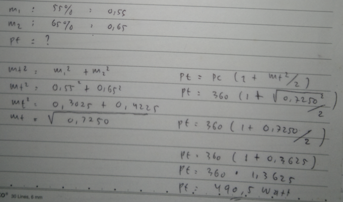 Suatu RF 360 watt, dimodulasi secara serentak oleh gelombang Audio yang mempunyai presentase modulasi masing-masing 55 dan 65. Berapakah daya total side Band yang diradiasikan?